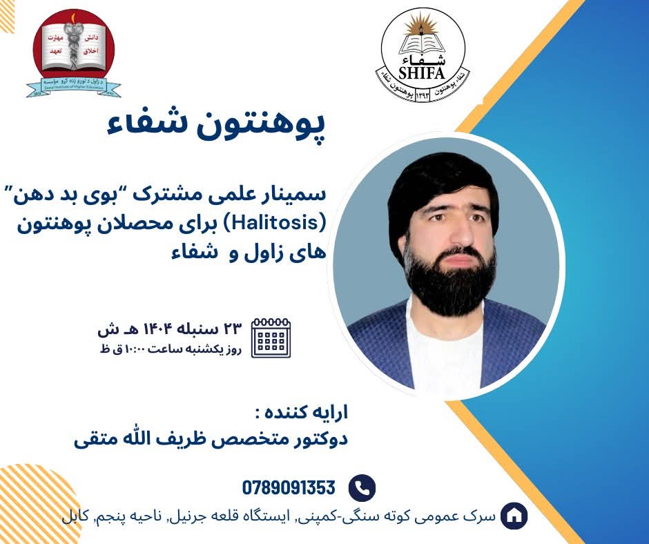 سمینار علمی مشترک:” بوی بد دهن”(Halitosis) برای محصلان پوهنتونهای زاول و شفاء برگزار خواهد شد.