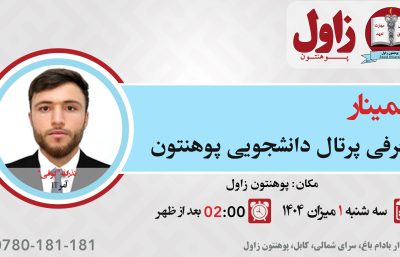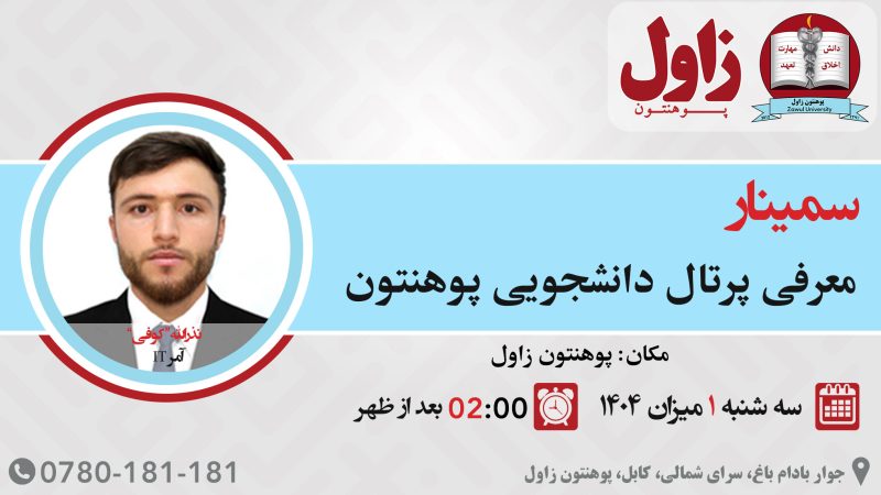 سمینار معرفی پرتال دانشجویی پوهنتون زاول به تاریخ1/7/1404، ساعت 2 ب_ظ توسط استاد نذر الله کوفی آمر تکنالوژی معلوماتی، برای دانشجویان، برگزار می گردد.