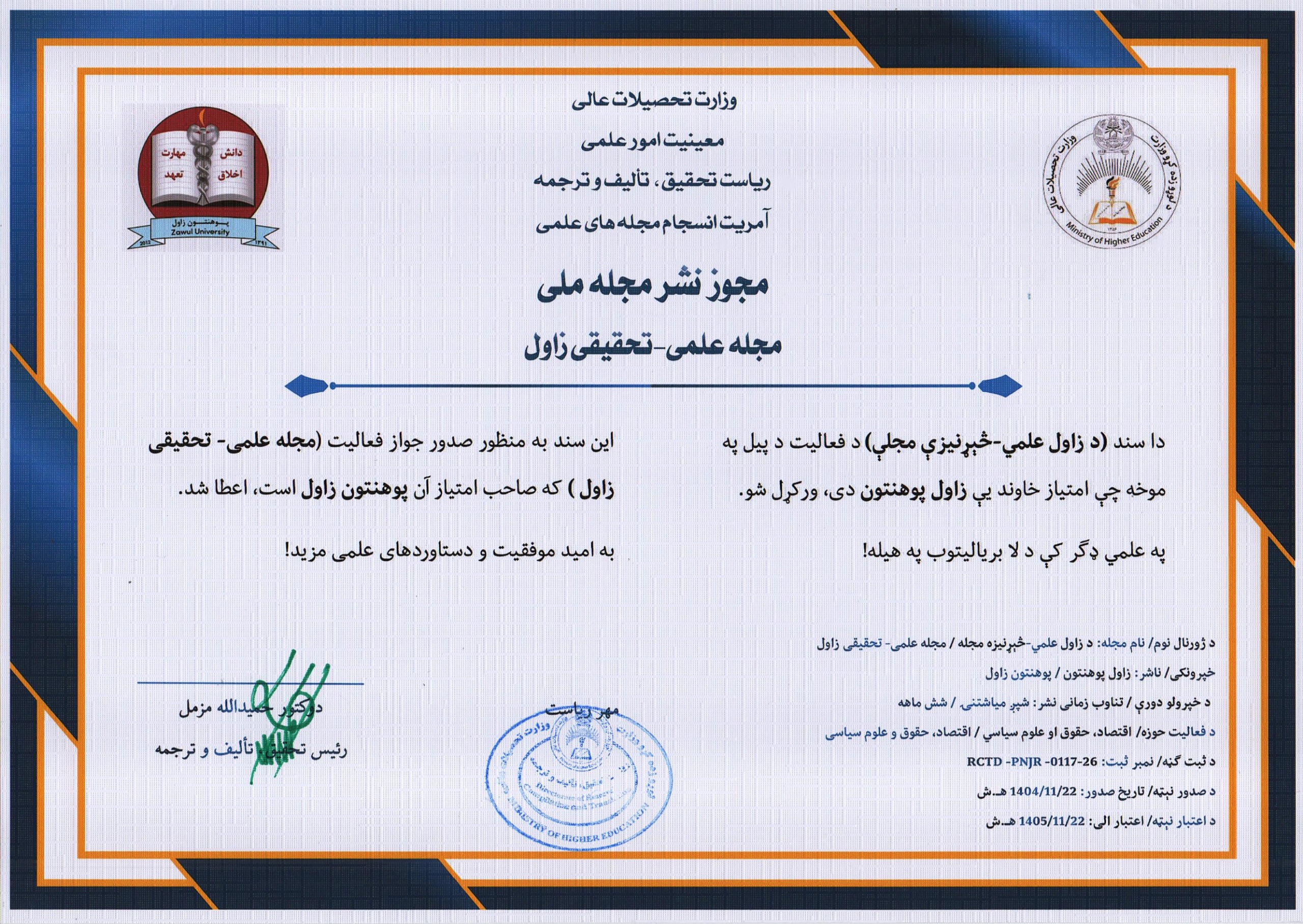 پوهنتون زاول با افتخار اعلام میدارد که موفق به اخذ مجوز رسمی نشر «مجله علمی ـ تحقیقی زاول» از سوی ریاست تحقیق، تألیف و ترجمه وزارت محترم تحصیلات عالی کشور گردیده است. این مجوز پس از طی مراحل قانونی، ارزیابیهای تخصصی و احراز معیارهای نشر علمی صادر شده و نشاندهنده عزم و تعهد این نهاد علمی در جهت ارتقای کیفیت پژوهش، گسترش تولیدات علمی و تقویت فعالیتهای تحقیقاتی میباشد.